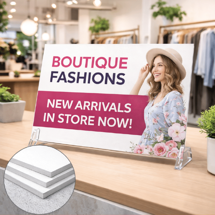 Printed on bright white 3mm PVC, these signs deliver crisp detail, vibrant color, and a clean edge finish that looks great in any setting. Use them freestanding on easels, mounted to walls, or hung with grommets.